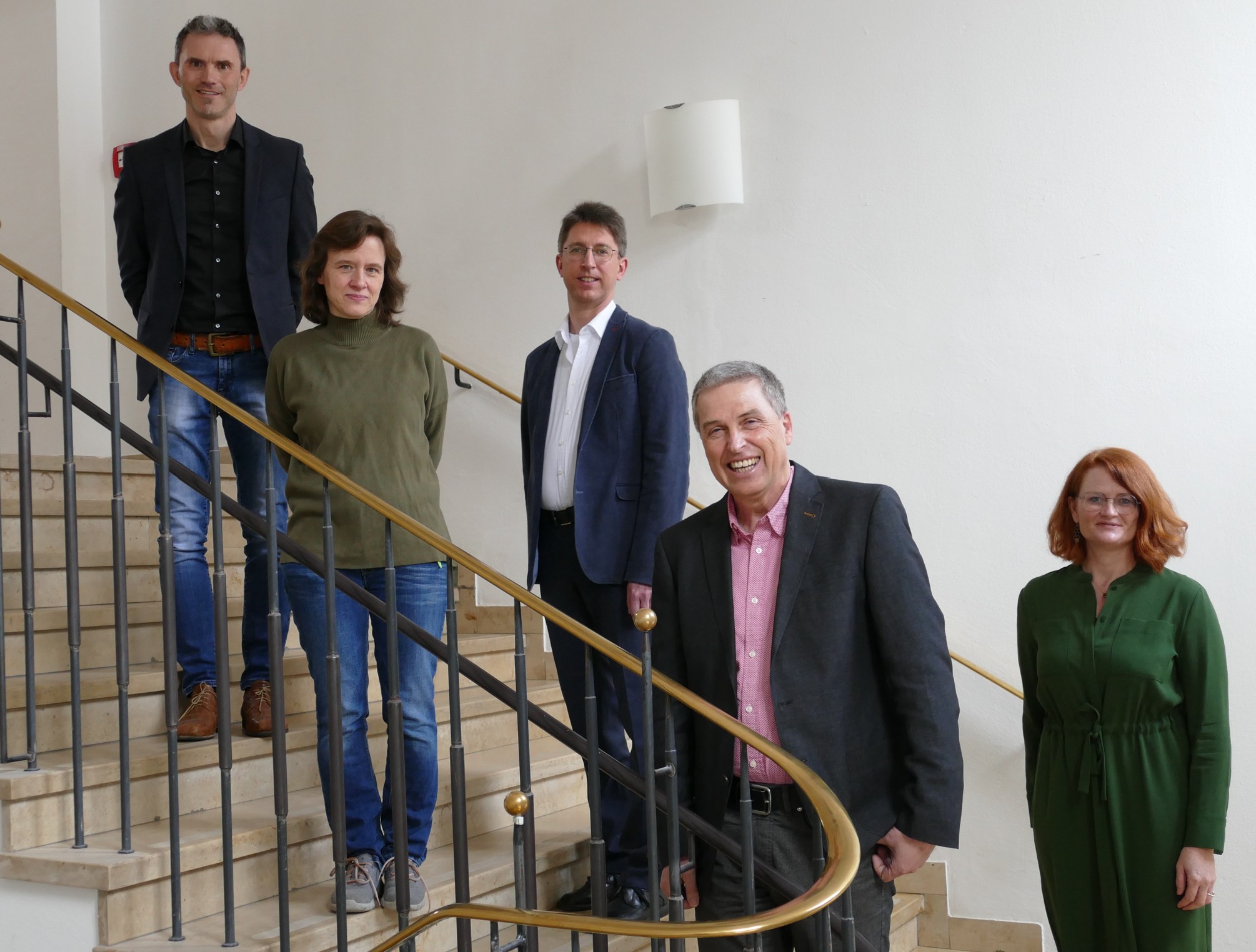 Die Schulleitung: Schulleiter Hr. Wagner (4.v.l) , Stellvertreter Hr. Nagel (1.v.l), und die Mitglieder der Erweiterten Schulleitung: Fr. Dr. Tannenberg (2.v.l.), Hr. Müller (3.v.l) und Frau Ott (5.v.l)