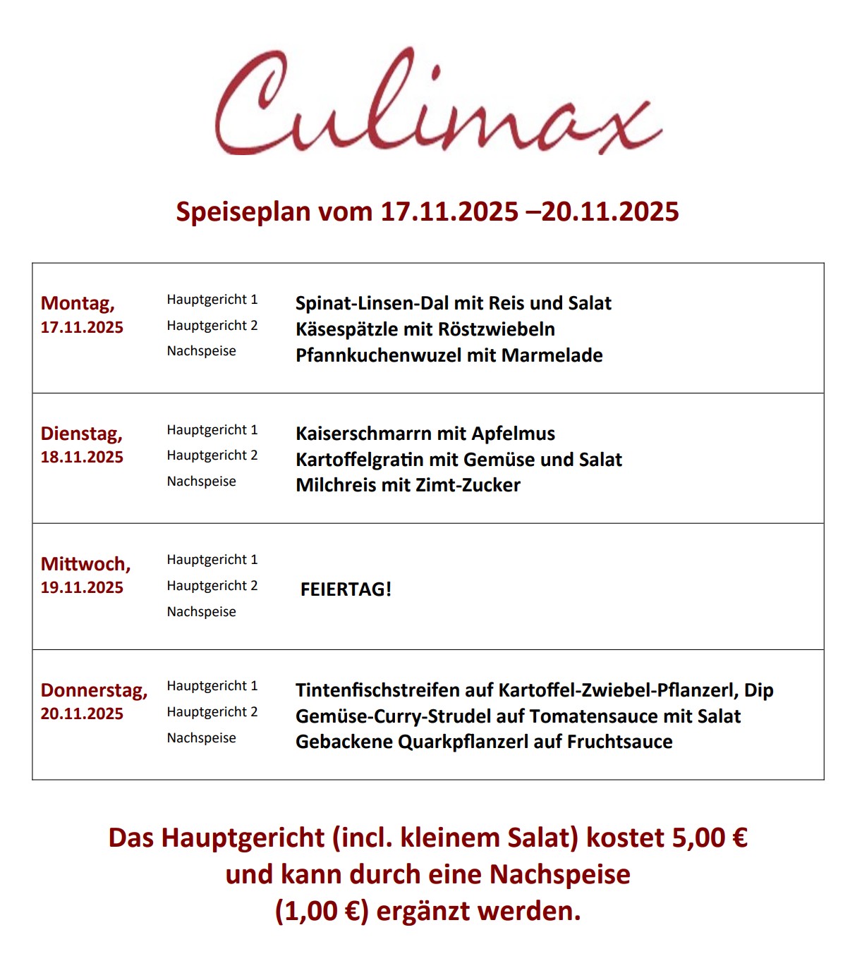 - Hauptgericht (incl. kleiner Salat): 5,00€, Nachspeise: 1,00€